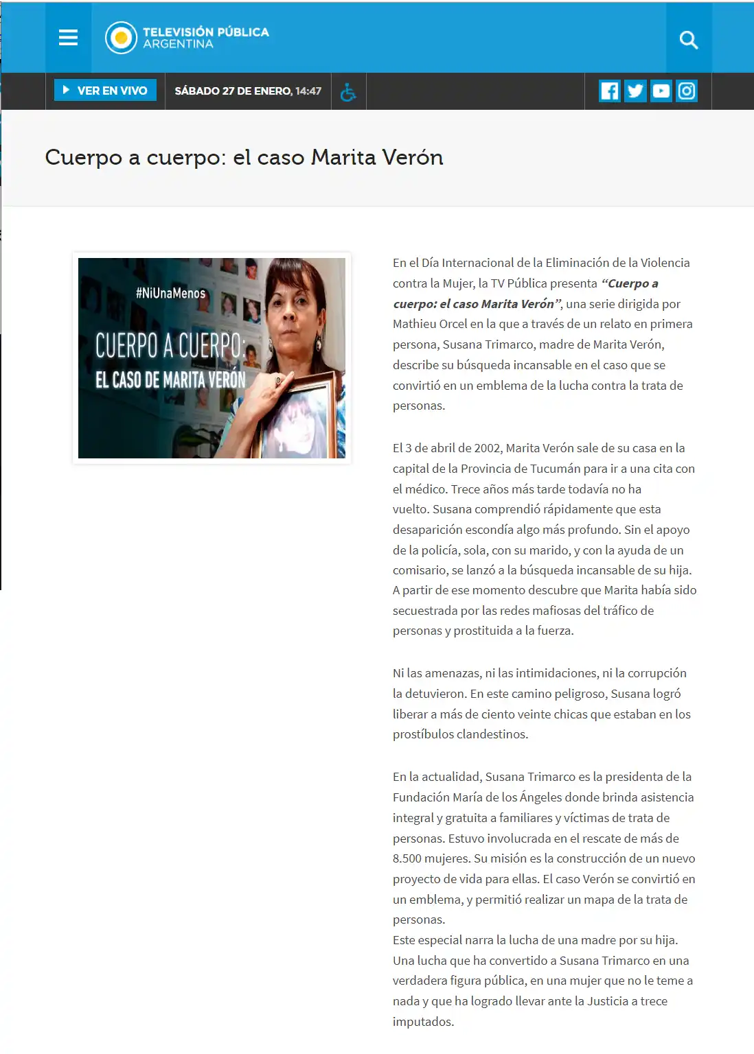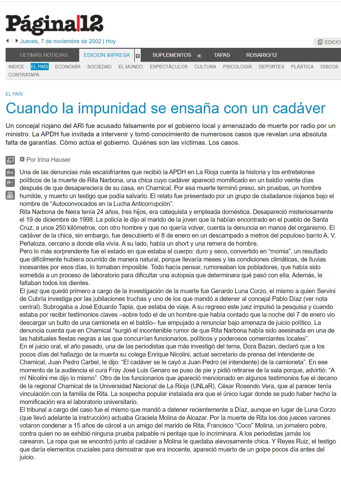 A Rita Narbona la violaron, asesinaron y luego momificaron su cuerpo en Chamical, Provincia de La Rioja. El pueblo se movilizó reclamando que esto era un ejercicio popular que se venía realizando desde la última dictadura. Intentaron hacerla pasar por prostituta; fue víctima del poder y muchas fuerzas se vieron implicadas, llegando el caso a la APDH. Se acusó a un hombre que apareció muerto en prisión, de quien el pueblo jamás creyó que estuviera implicado.